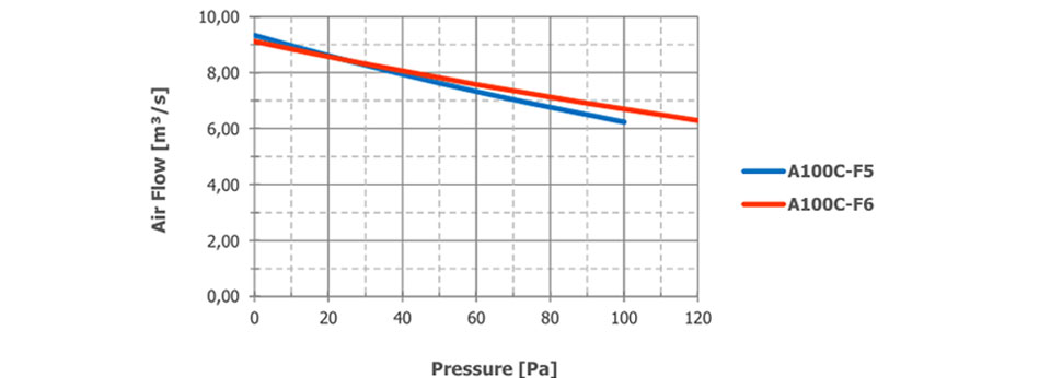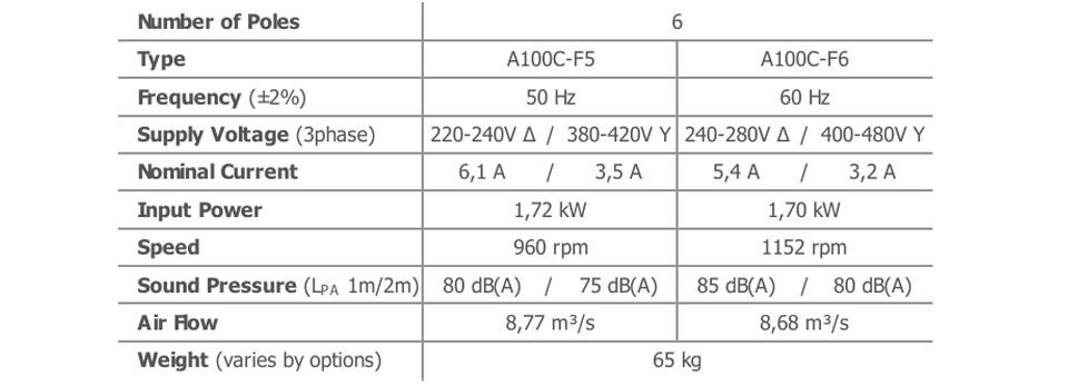 Hava akışı ve ses basınç seviyesi (SPL), giriş ve çıkış koruma ızgaraları ile serbest üfleme çalışması için verilmiştir. 1 m'deki SPL değerleri fanın yanından ölçülmüştür. 2 m'deki SPL değerleri ters kare yasası ile hesaplanmıştır. Beyan edilen değerler talep edilen seçeneklere ve yapılandırmalara göre değişebilir.